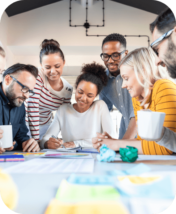 A team gathers together in-person to brainstorm in a meeting, with everyone sharing ideas in real-time and simultaneously grouping suggestions by theme. Once organized, the group can begin to filter ideas out by quality, category, potential and more.