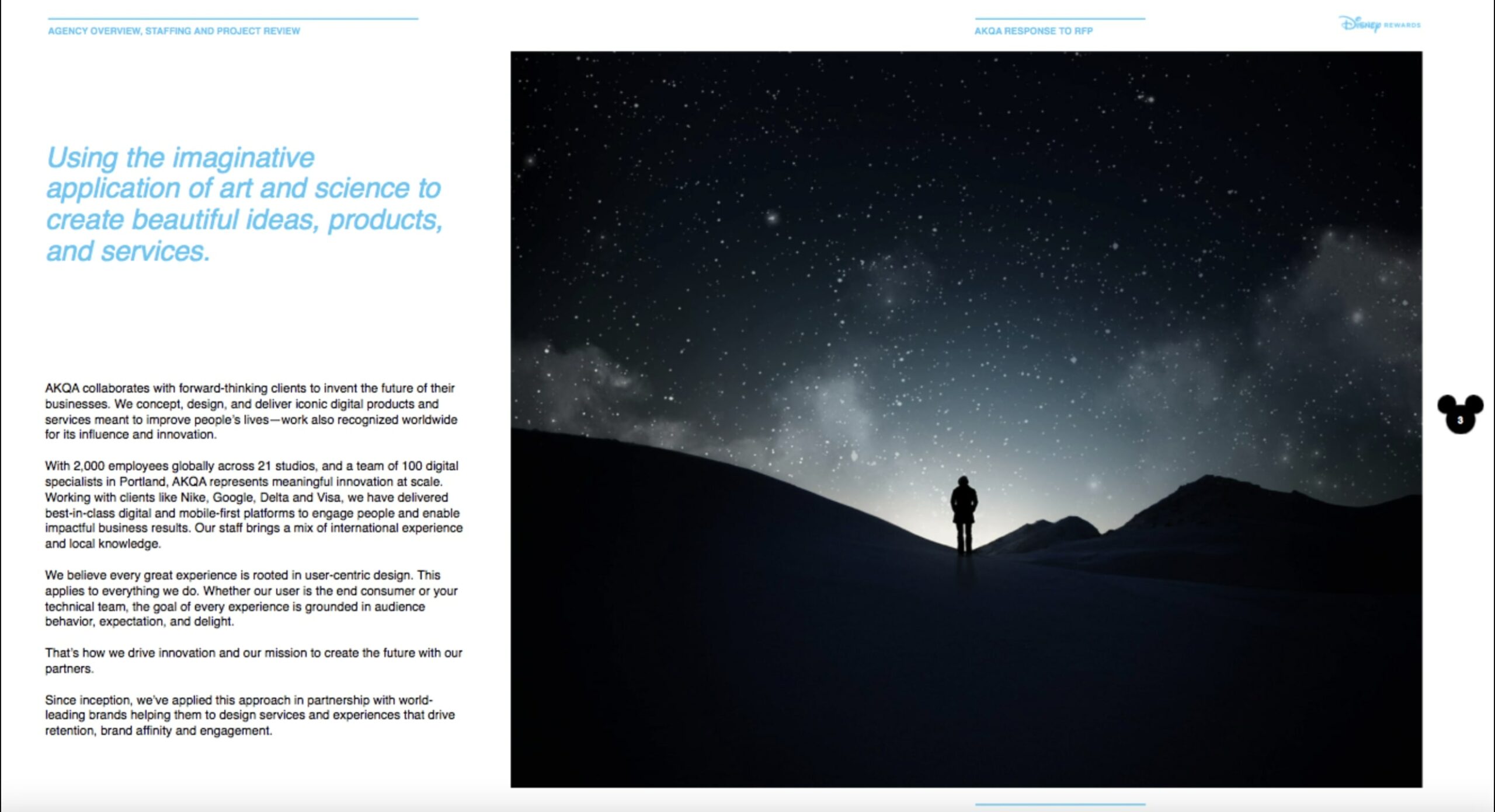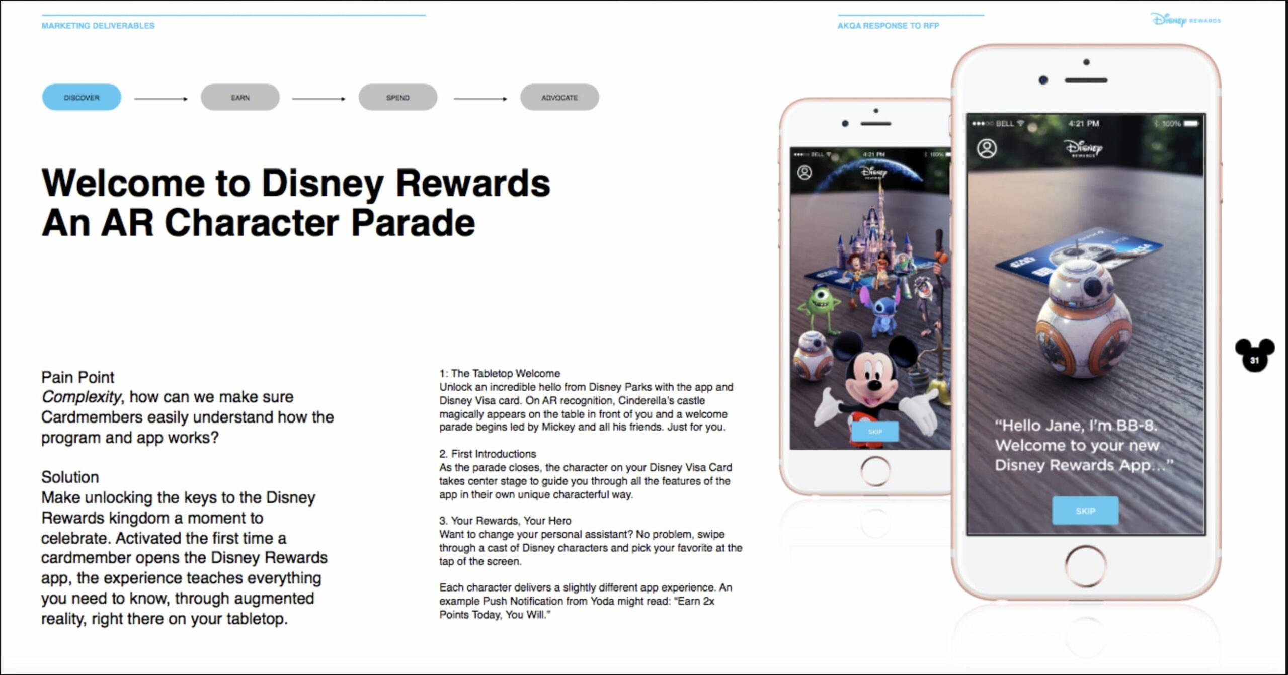 Role: As Senior Copywriter on the Disney pitch, I was responsible for coming up with thought starters and ideas for the Disney Rewards mobile app experience and consumer journey. I was also tasked with copywriting and copyediting for the Creative and Technology sections, and proofreading the entire deck.