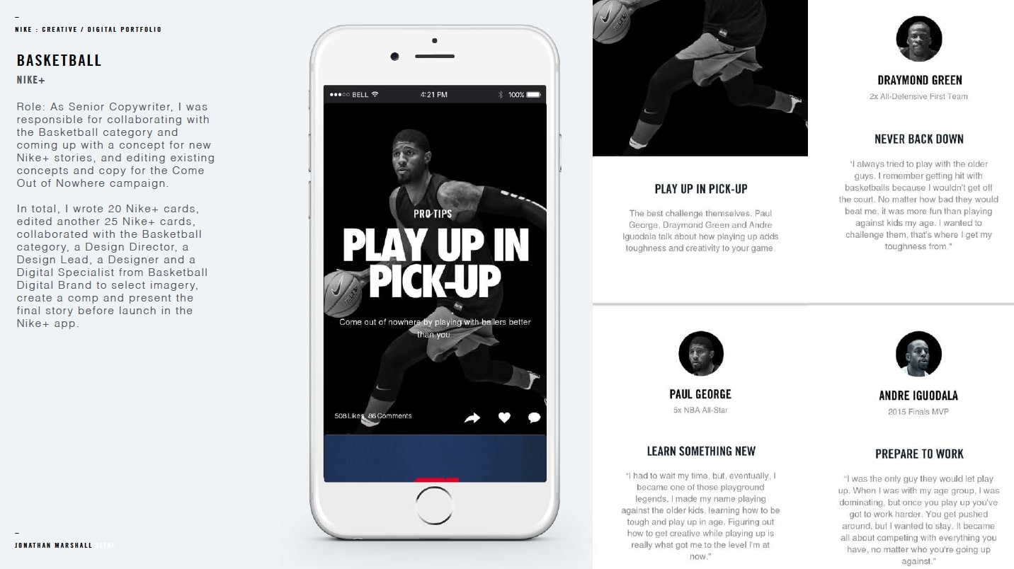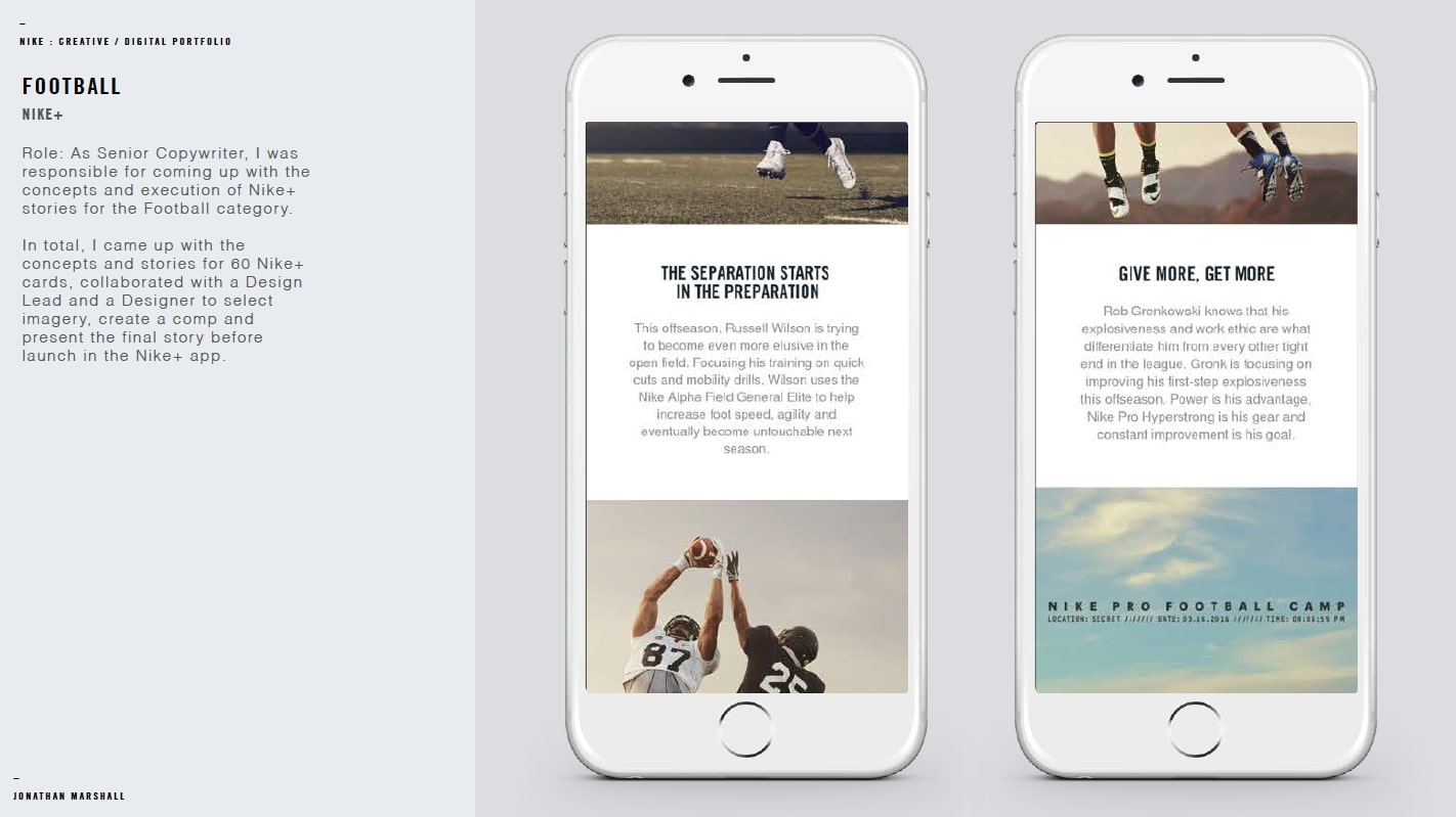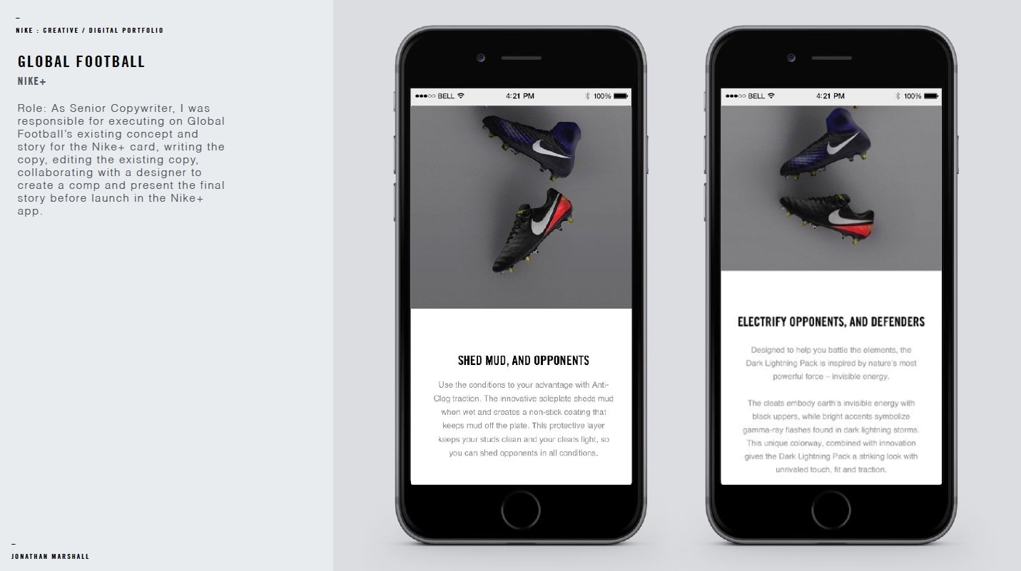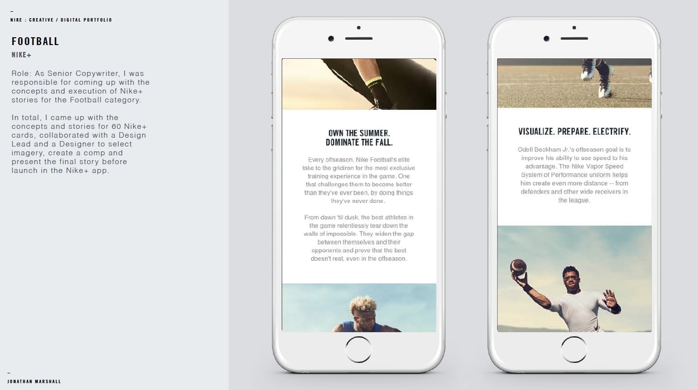 Role: As Senior Copywriter at/on Nike, I was responsible for everything from digital copy, strategy and ideas to scripts, creative direction at photo, video shoots and editorial content.