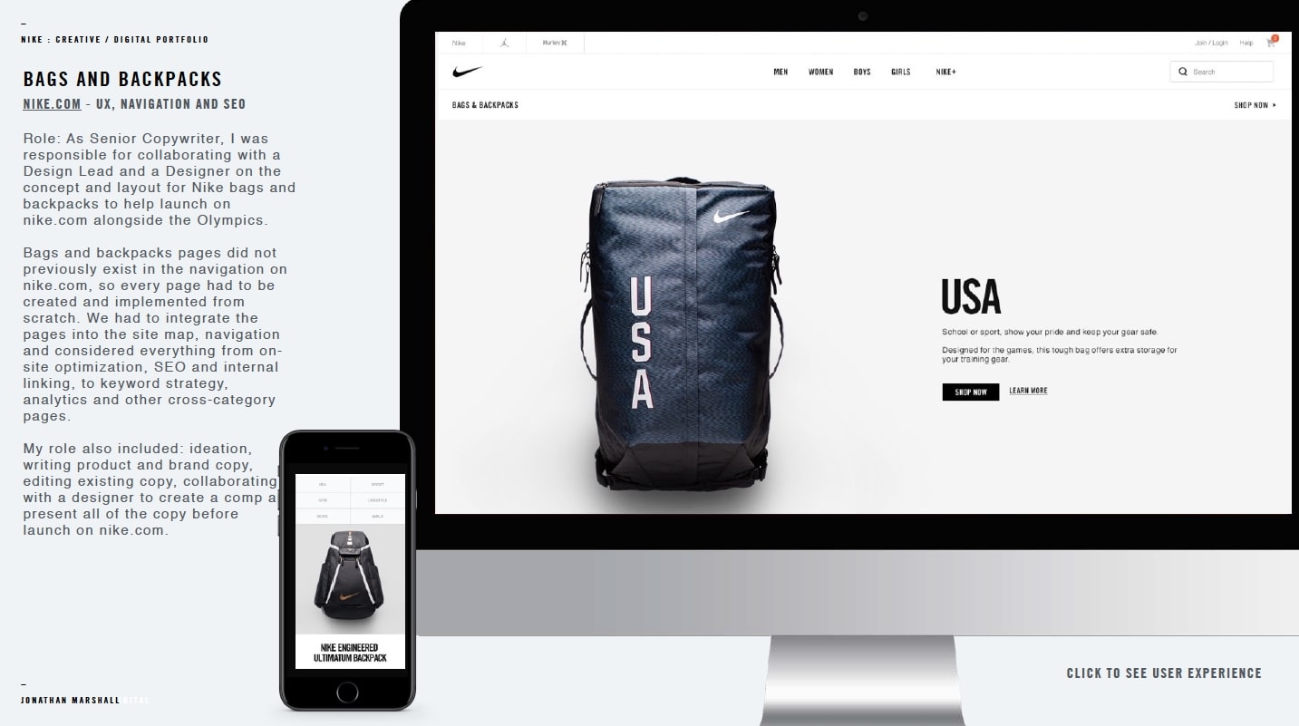 Project: Nike.com website copy for Bags and Backpacks pages to launch for the 2016 Olympics.