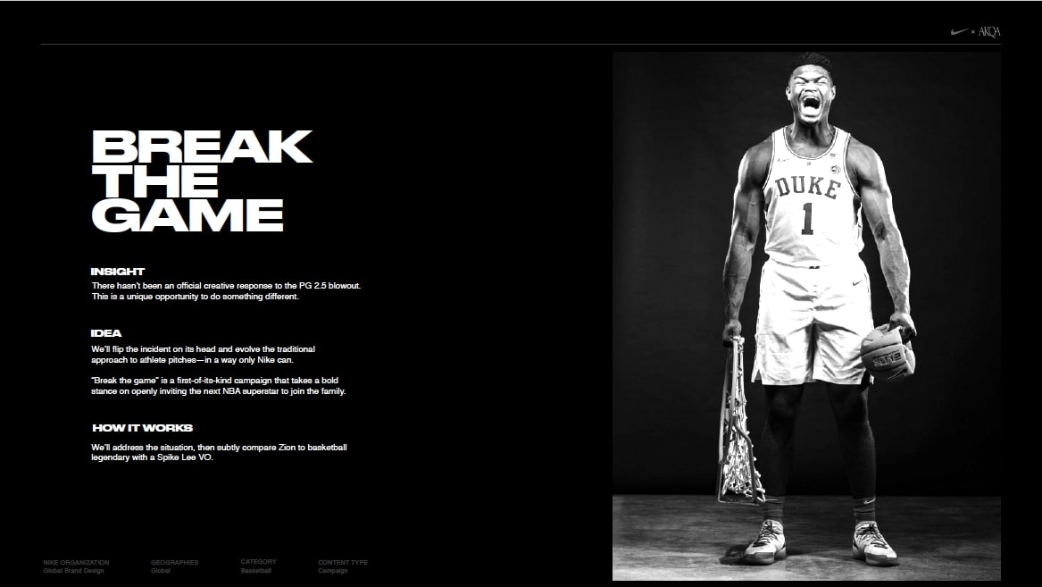 Role: I was responsible for coming up with the campaign idea, the 30-second script and storyboard for Zion Williamson.