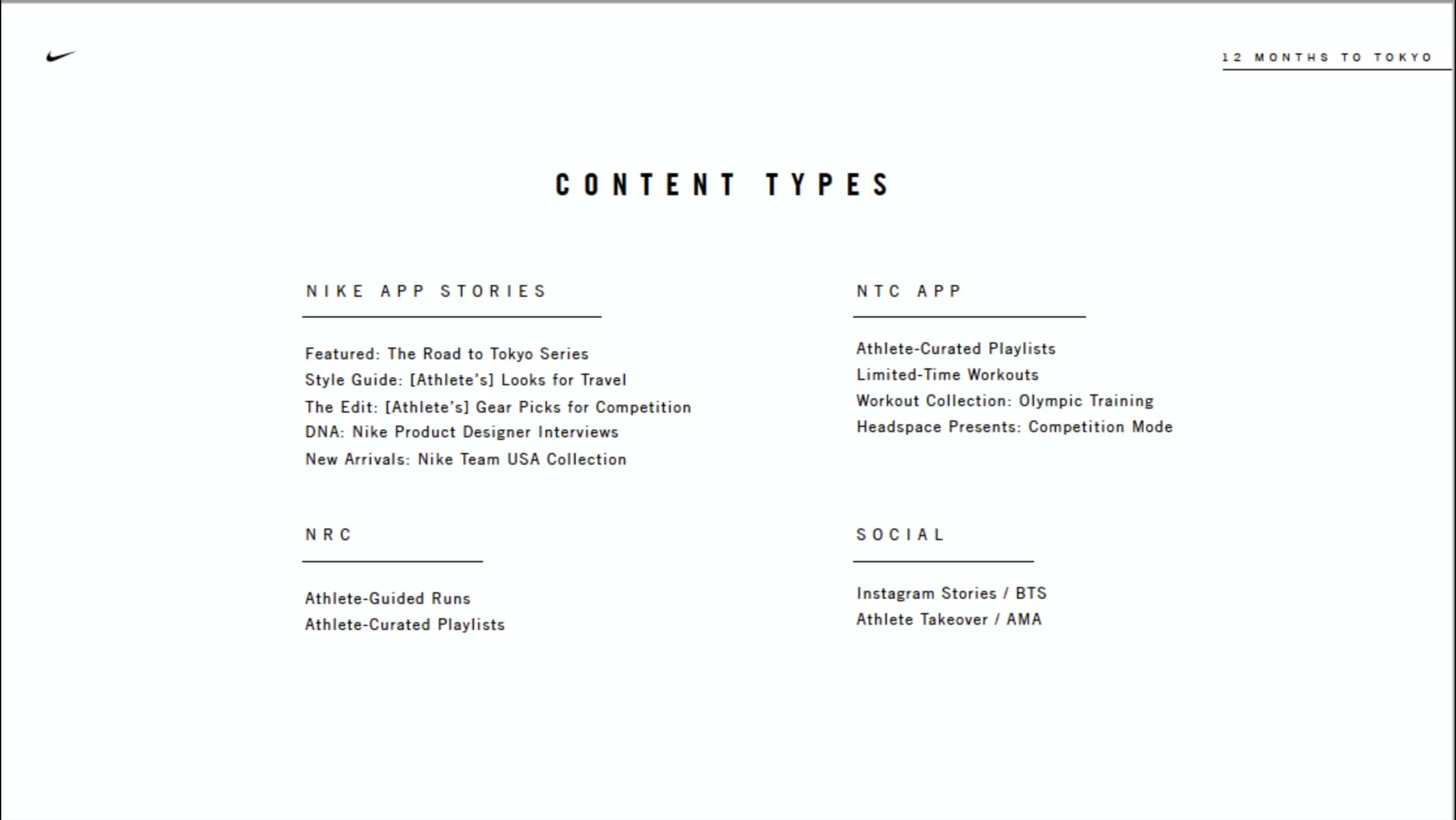 Role: I was responsible for coming up with the editorialized series, ideas for content strategy, monthly calendar themes and explorational athlete moodboards and storyboards for Nike Sportswear, their partnership and the brands role in the 2020 Olympics in Tokyo, Japan.