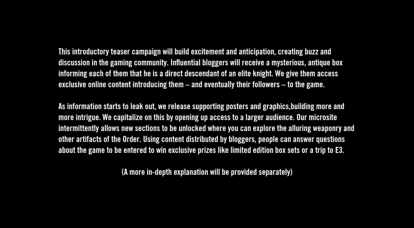 Role: As Senior Copywriter, I was responsible for researching, concepting and developing an overarching branding strategy alongside an experiential marketing campaign that would support the Key Art for The Order: 1886.